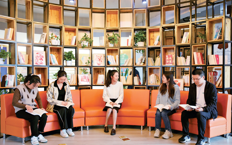 图为2024年2月,浙江省台州市天台县平桥镇的年轻党员围绕学习习近平总书记关于党的自我革命的重要思想,在“清廉书吧”开展“赤心谈”研讨活动,谈感悟、话体会。