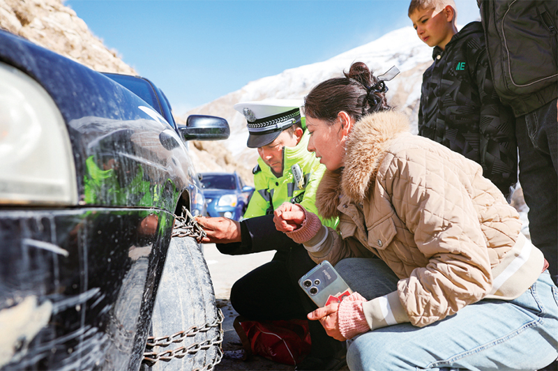 多年来,当学生寒暑假大规模返校和回家时,新疆叶城县都会组织党员干部带队,动员县、乡、村三级力量,用心用情守护上学路。图为2024年2月22日,在前往西合休乡中心小学翻越海拔4000多米的雪山途中,驾驶员和叶城县公安局交通管理大队工作人员一起为接送学生的车辆安装防滑链。